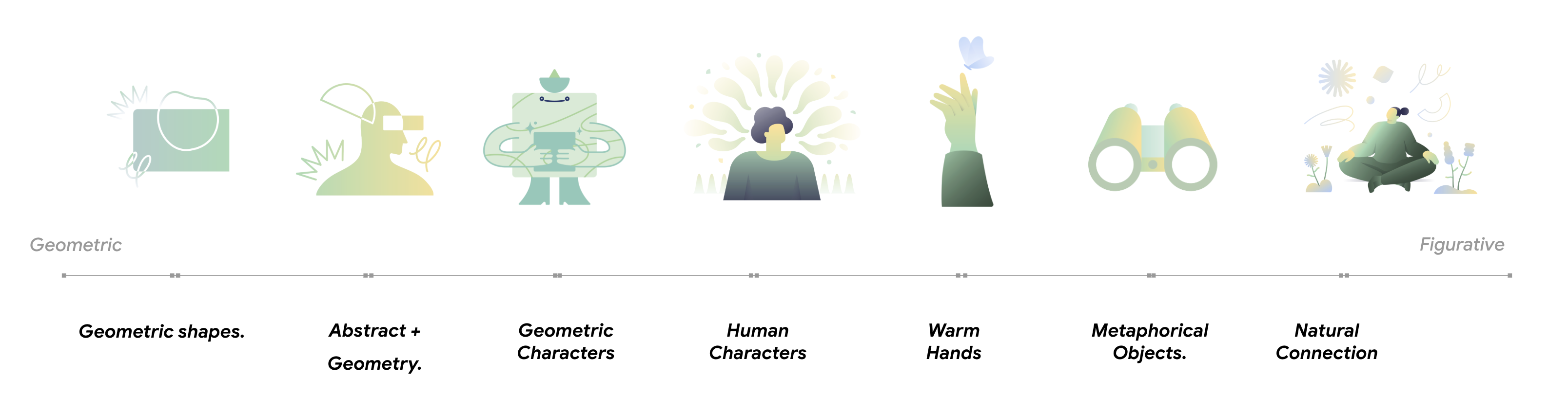 We created a genderless character with neutral expressions with actions that represent the feelings that people are going through. Additionally, the proposal is based on gradients to represent a person's path from darkness to hope. Also, gradients allow to explore a wide range of emotions and feelings.